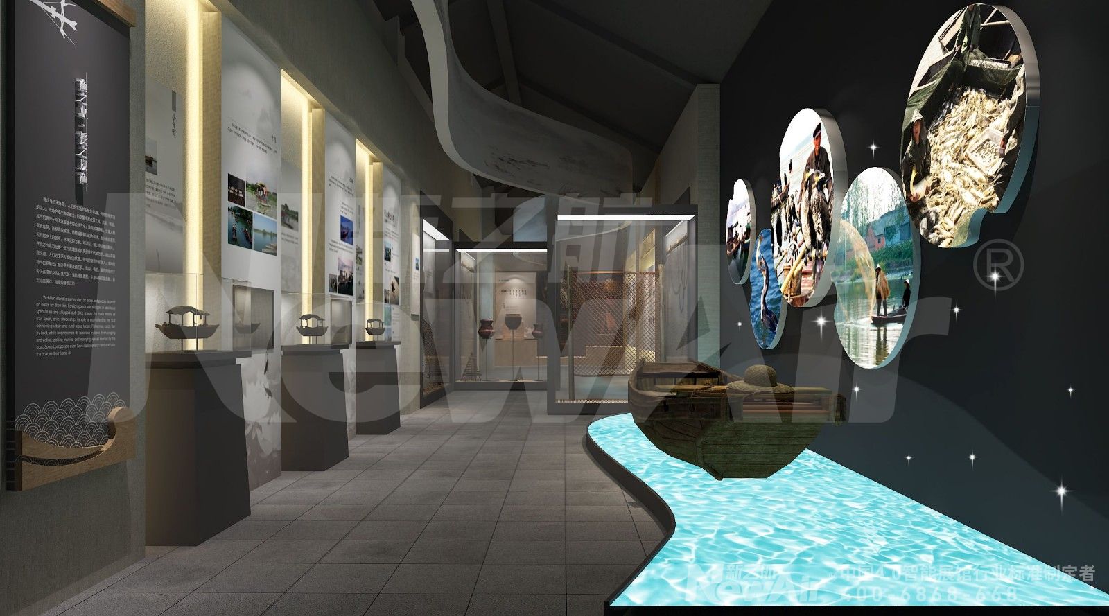 為深入了解當(dāng)?shù)氐拿袼孜幕?,新之航?xiàng)目團(tuán)隊(duì)在微山島駐扎,體驗(yàn)漁民生活,走訪歷史專家,在此基礎(chǔ)上閱讀了上百部關(guān)于微山島的書籍文獻(xiàn),從漁家作業(yè)方式、漁家飲食、漁家傳統(tǒng)民俗三個(gè)角度深挖,展現(xiàn)百年來漁民生活方式的變遷。 微山島四面有遼闊的水域,物產(chǎn)豐富,新之航設(shè)計(jì)團(tuán)隊(duì)發(fā)揮巧思,采用動(dòng)植物模型與互動(dòng)式櫥窗的組合,展示微山島人民 “靠水吃水”的生存智慧。 在展館頂面,一幅描繪漁家生活的水墨畫卷串聯(lián)起各展示空間。畫卷以“微湖水波”為設(shè)計(jì)靈感,蜿蜒伸展的造型為展館增添自然靈動(dòng)的氛圍。觀眾仰望畫卷,可見展品所融入的生活場(chǎng)景,加深參觀印象。水墨山水式的表達(dá),更添文化與韻味。 圖文展墻結(jié)合菜肴模型,展示微山湖全魚宴、烏鱧宴、荷花宴等特色宴席,引發(fā)觀眾對(duì)微山島美食的興趣,同時(shí)促進(jìn)本地餐飲行業(yè)發(fā)展。