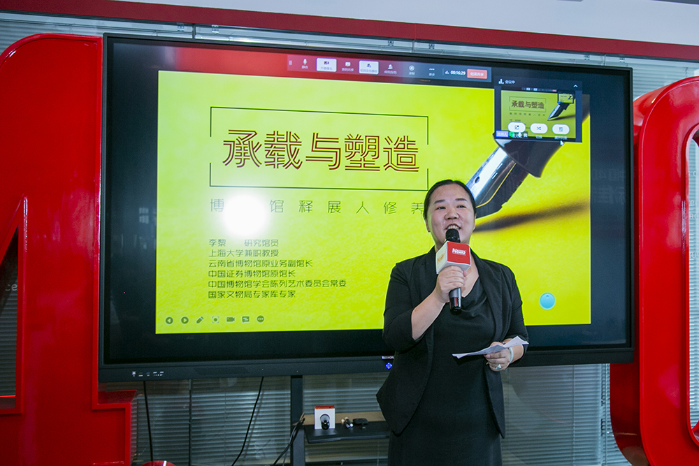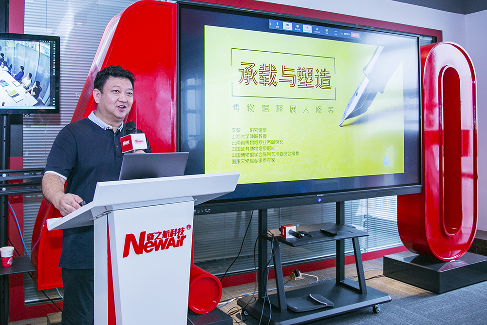 培訓(xùn)開始前,李黎在新之航傳媒科技集團(tuán)董事長鞠航、總經(jīng)理傅繹錦陪同下參觀集團(tuán)總部,詳細(xì)了解新之航數(shù)字智能化展館版塊,并對企業(yè)綜合實力予以高度評價。本次培訓(xùn)會的主題為“承載與塑造——博物館釋展人修養(yǎng)”。李黎結(jié)合這一主題,從“策展”和“釋展”的時代需求與個性體驗、科技創(chuàng)新的關(guān)系,及文博產(chǎn)業(yè)未來趨勢等維度予以分析與闡釋,并強調(diào)從業(yè)者應(yīng)“回歸初心的展示之道”。研究館員、上海大學(xué)兼職教授、中國博物館協(xié)會陳列藝術(shù)委員會常委、國家文物局專家?guī)鞂<依罾?/section>新之航傳媒科技集團(tuán)總經(jīng)理傅繹錦